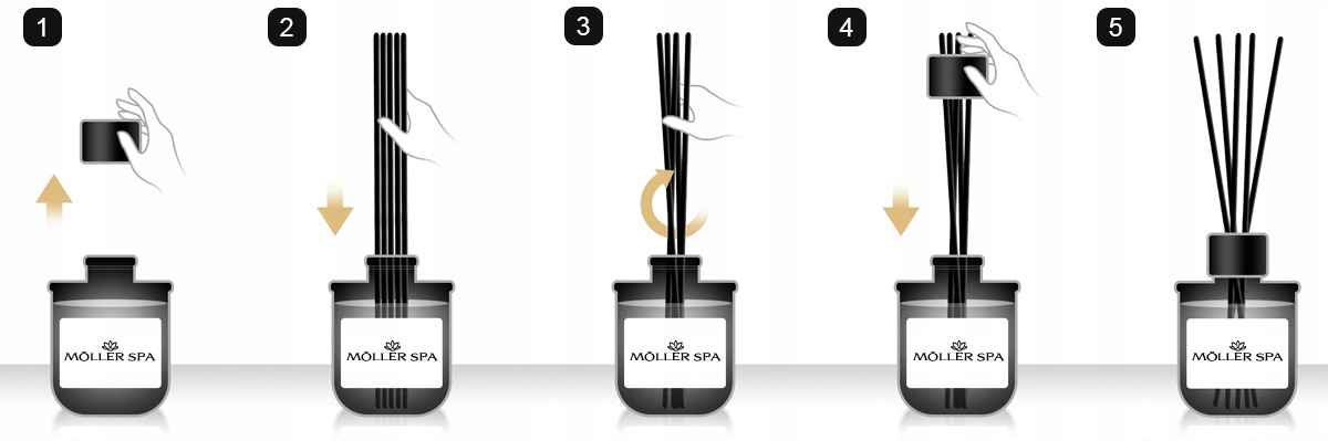 - ROTIREA BEȚIȘOARELOR - Primul pas este rotirea bețișoarelor o dată pe săptămână. Acest lucru va asigura eliberarea optimă și uniformă a parfumurilor. Înlocuiți bețișoarele cel puțin la fiecare trei luni și ori de câte ori se schimbă parfumul.